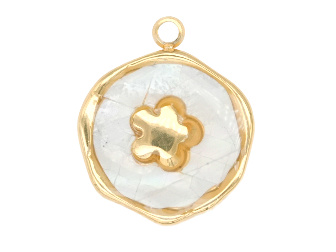 - ACERO DORADO DIJE REDONDO FLOR NACAR BLANCO 13MM