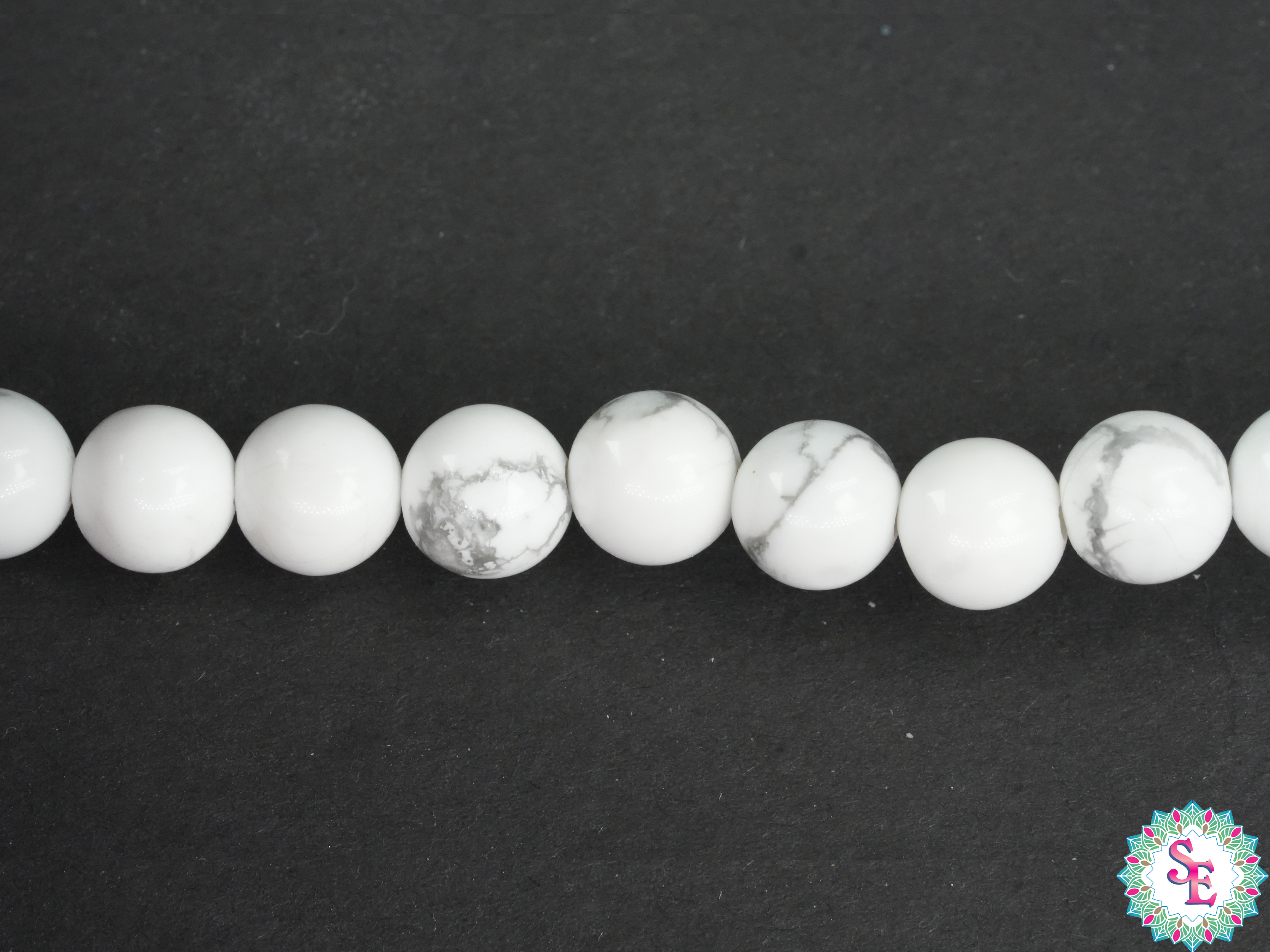Cada piedra de howlita en esta sarta ha sido cuidadosamente seleccionada para asegurar su calidad y belleza. La howlita es una piedra natural conocida por su aspecto marmoleado con vetas blancas, grises y negras, lo que la convierte en una opción elegante y contemporánea para tus diseños.