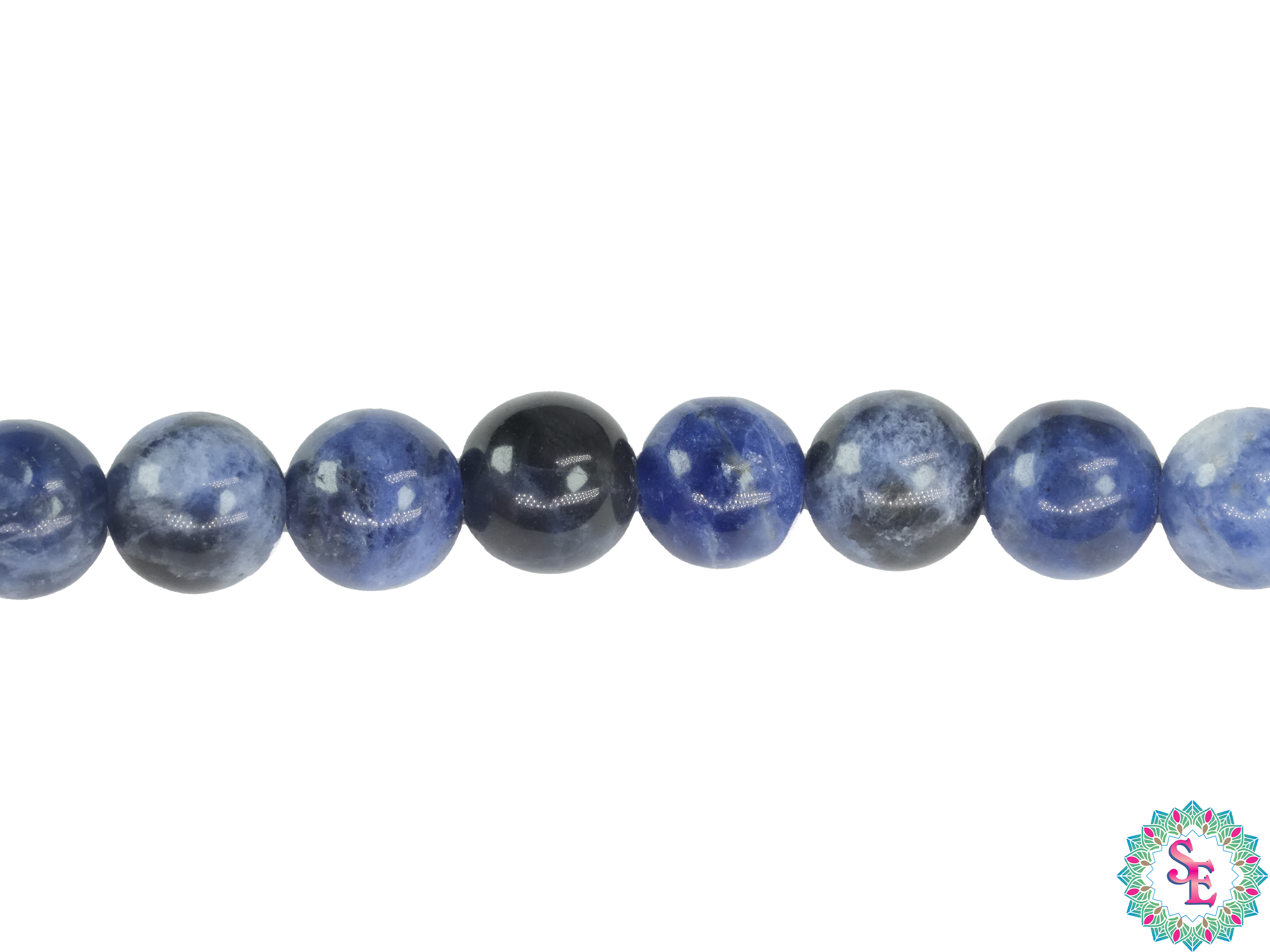 La Sodalita es una piedra semipreciosa conocida por su color azul profundo y su patrón de vetas blancas, que le otorgan un aspecto único y cautivador. Cada cuenta de 6 mm ha sido pulida cuidadosamente para resaltar su belleza natural y garantizar su calidad excepcional, lo que resulta en un acabado brillante y sofisticado.