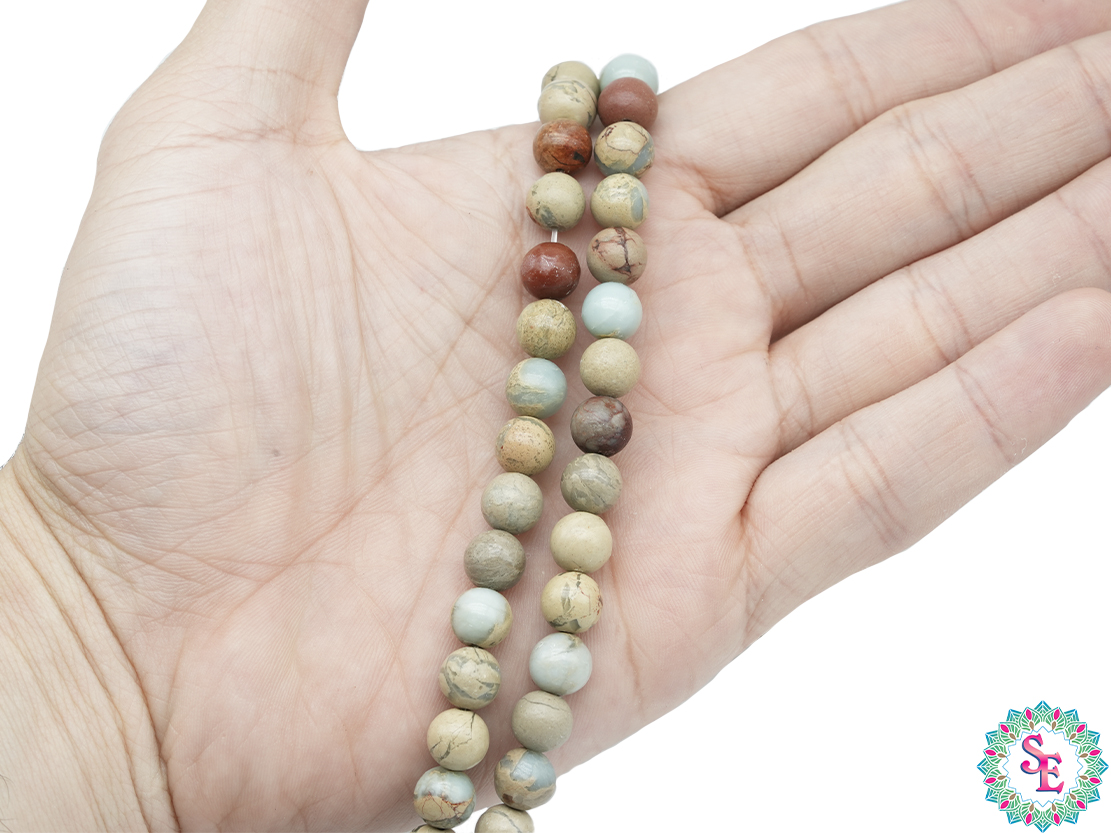 Cada cuenta de 8 mm ha sido cuidadosamente seleccionada para ofrecerte una sarta de piedra natural de alta calidad con las distintivas vetas y tonalidades de la Jasper Serpentina. Esta piedra es conocida por su aspecto único y atractivo, que combina tonos verdes, marrones y cremas, creando un diseño que evoca la belleza de la naturaleza.